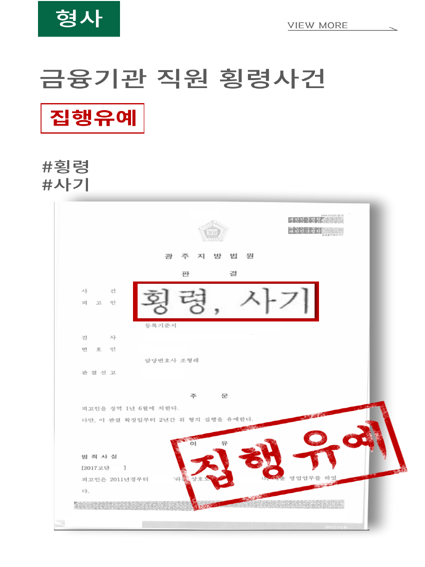 조형래 광주변호사는 의뢰인에게 동종전과가 없고 피해자들과 합의하는 등 의뢰인에게 유리하게 작용할 수 있는 양형참작 사유를 파악하고 자료를 풍부하게 수집하는 등 적극적으로 대응하여 피해금액이 적은 액수가 아님에도 불구하고 집행유예라는 결과를 받아낼 수 있었습니다.