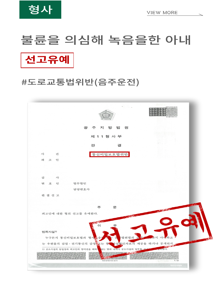 의뢰인은 남편의 불륜 증거를 확보하기 위해 불법녹취를 하게 됐습니다. 이런 행위가 형사적으로 중한 처벌 대상이라는걸 몰랐던 의뢰인은 이혼소송에 이를 증거로 제출했다가 되려 남편과 불륜녀에게 고소를 당해 전과자가 될 억울한 상황에 처했습니다. 다행히 조형래 형사전문변호사의 적절한 조력으로 판사님을 설득해 선고유예 판결을 받아 구속되지 않고 아무런 불이익도 당하지 않을 수 있었습니다.