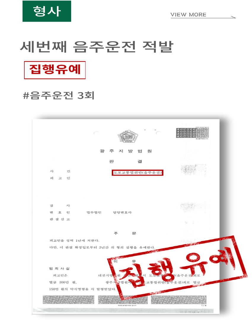 윤창호법이 가장 엄격하게 적용되던 시기여서 음주운전 2번째여도 징역 6월에서 1년 사이 실형이 선고되고 있는 상황에서 의뢰인은 더 중한 처벌을 받을 수밖에 없는 상황이었습니다. 혈중알코올농도도 사실상 만취상태에서 운전한 것과 다를바없어 실형은 피하기 어려워 보였습니다. 이러한 불리한 상황에서도 조형래 광주형사변호사와 전담팀은 최상의 변호전략을 수립하고 실행해서 집행유예라는 최상의 결과를 얻어냈습니다.