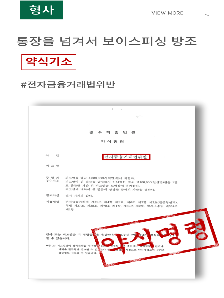 의뢰인이 보이스피싱 범행을 방조한 것으로 수사방향이 잡힐 경우 구속의 위험성이 적지 않았습니다. 다행히 의뢰인이 경찰수사 초기부터 도움을 구해와서 적절한 전략을 세울 수 있었고, 조형래 광주형사변호사는 의뢰인에게 사기방조죄 적용이 되지 않도록 철저한 전략을 세워 검사님을 설득하는데 성공하여 약식명령(벌금형)을 받아냈습니다.